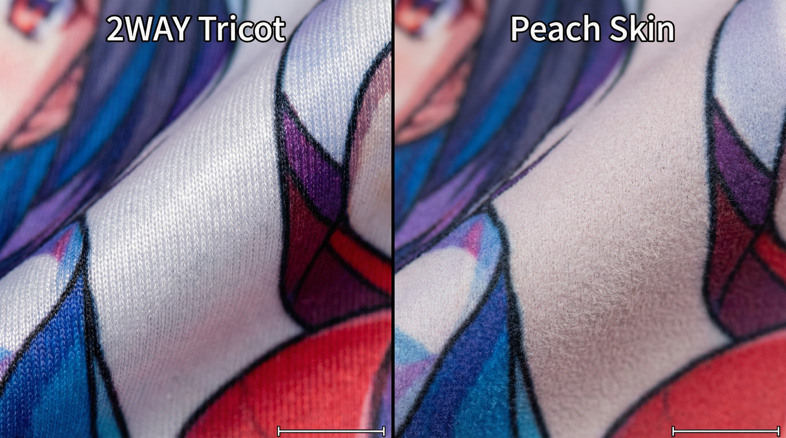 When browsing for Dakimakura covers, you will often see Peach Skin as a cheaper alternative. While Peach Skin has its merits (like high durability), it simply cannot compete with 2WAY Tricot when it comes to sensory experience.